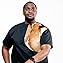 A man with a goatee standing against a white background. He is wearing a black short-sleeved shirt and has a brown and white animal print over his shoulder.